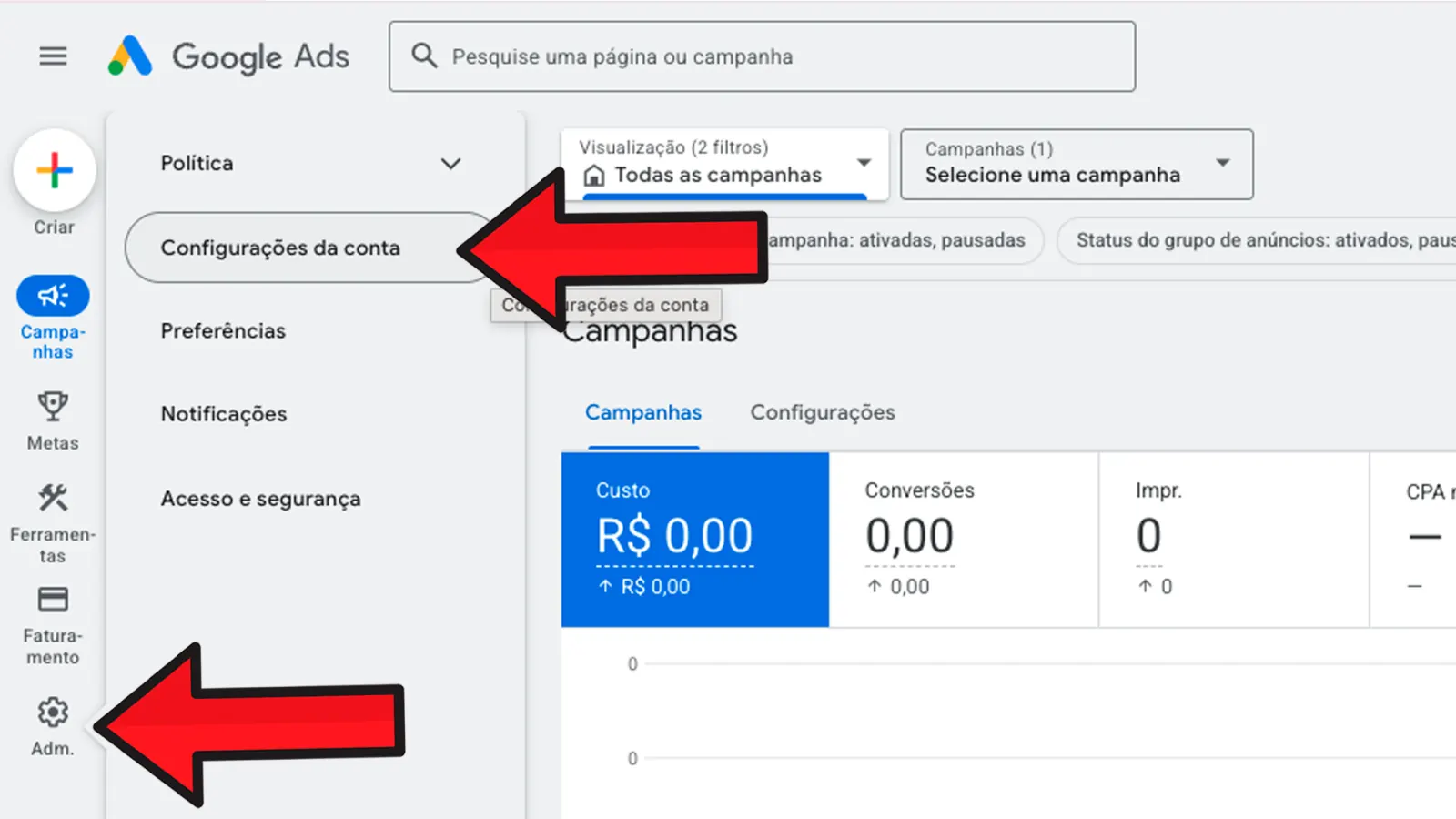 Faça login em ads.google.com com a conta administradora. Na barra lateral esquerda, role até o final e clique no ícone de engrenagem 'Adm.' (Administração).