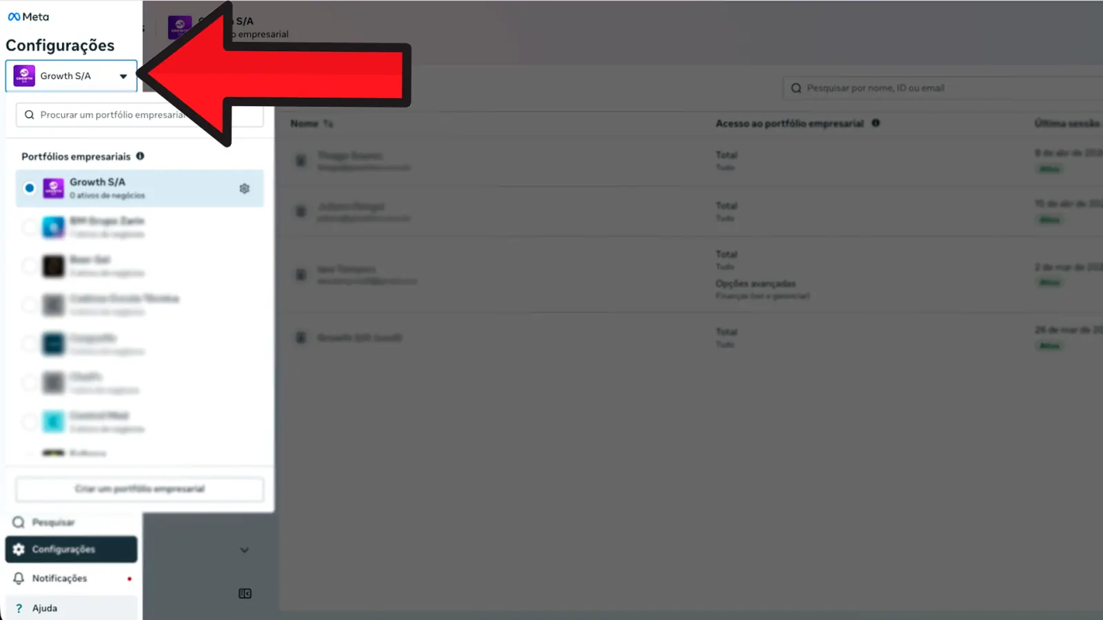Acesse o Meta Business Suite e, no canto superior esquerdo, clique no seletor de portfólio empresarial. Confirme que está no portfólio da sua empresa antes de prosseguir.